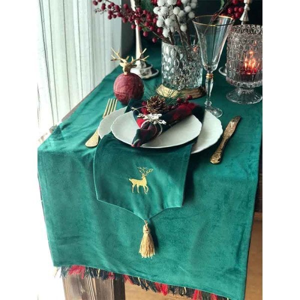 -İKİ YÖNLÜ KULLANILABİLEN RUNNER. BİR YÖNÜ YEŞİL KADİFE, DİĞER YÖNÜ EKOSE KUMAŞTIR. 30 DERECE YIKAMA ÖNERİLİR.