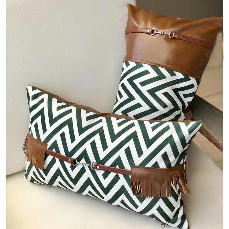 Taba Deri Püsküllü Yeşil Kırlent Kılıfı